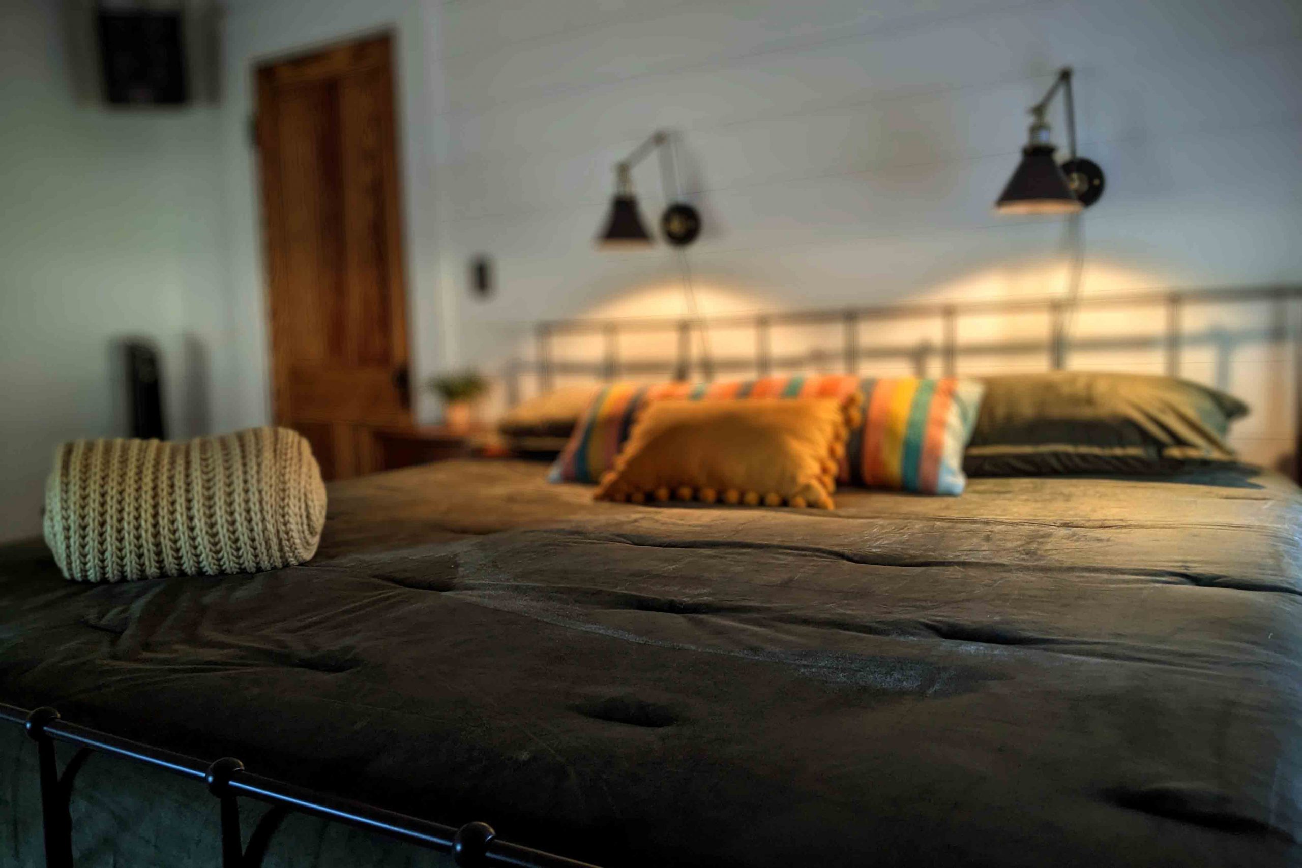 You’ll find an iron frame king size bed with a super comfy, quality memory foam mattress and linens.